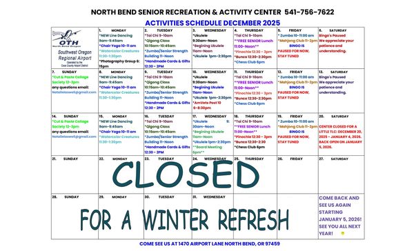 🎄 The Senior Center will be taking a little winter break from December 20 through January 4 to refresh, reorganize, and get ready for a bright new year!